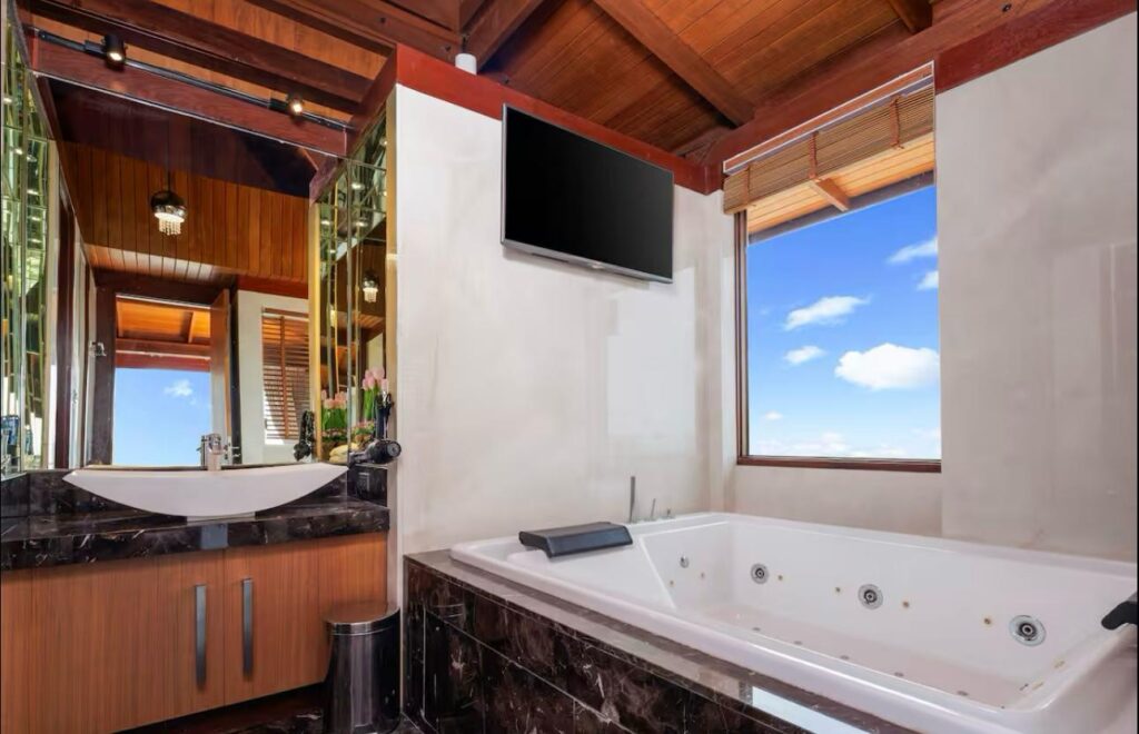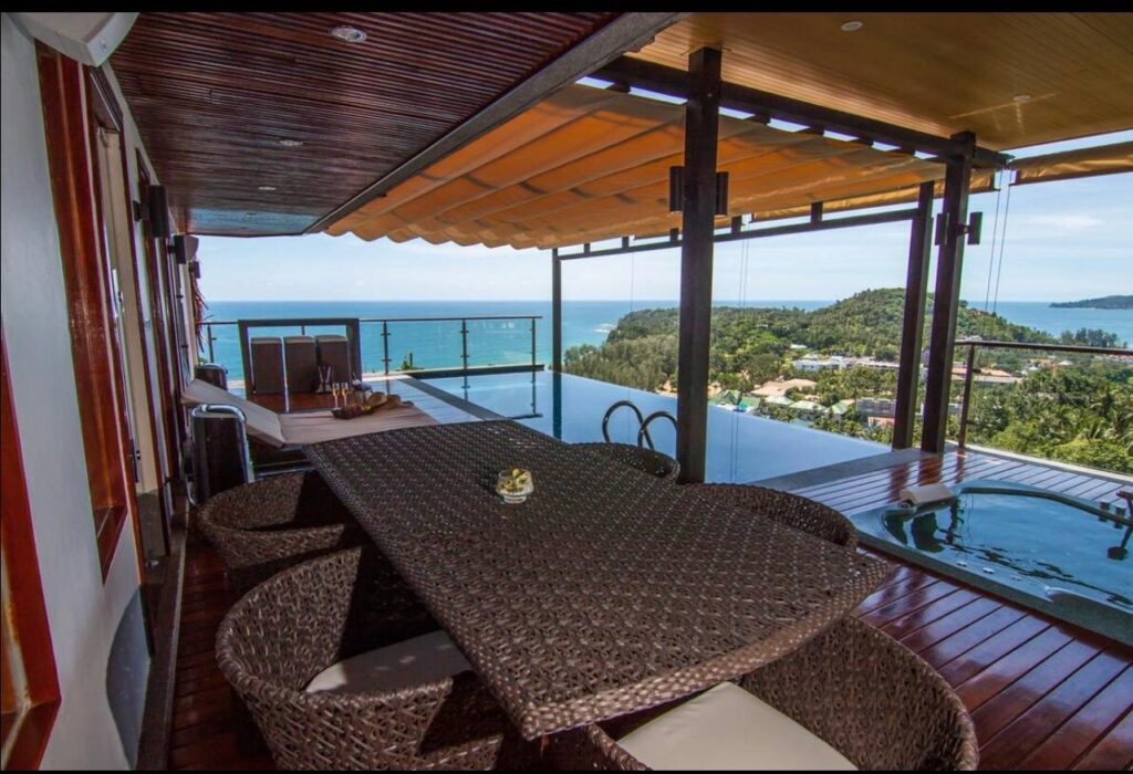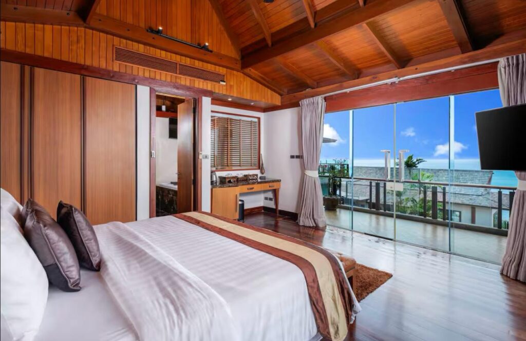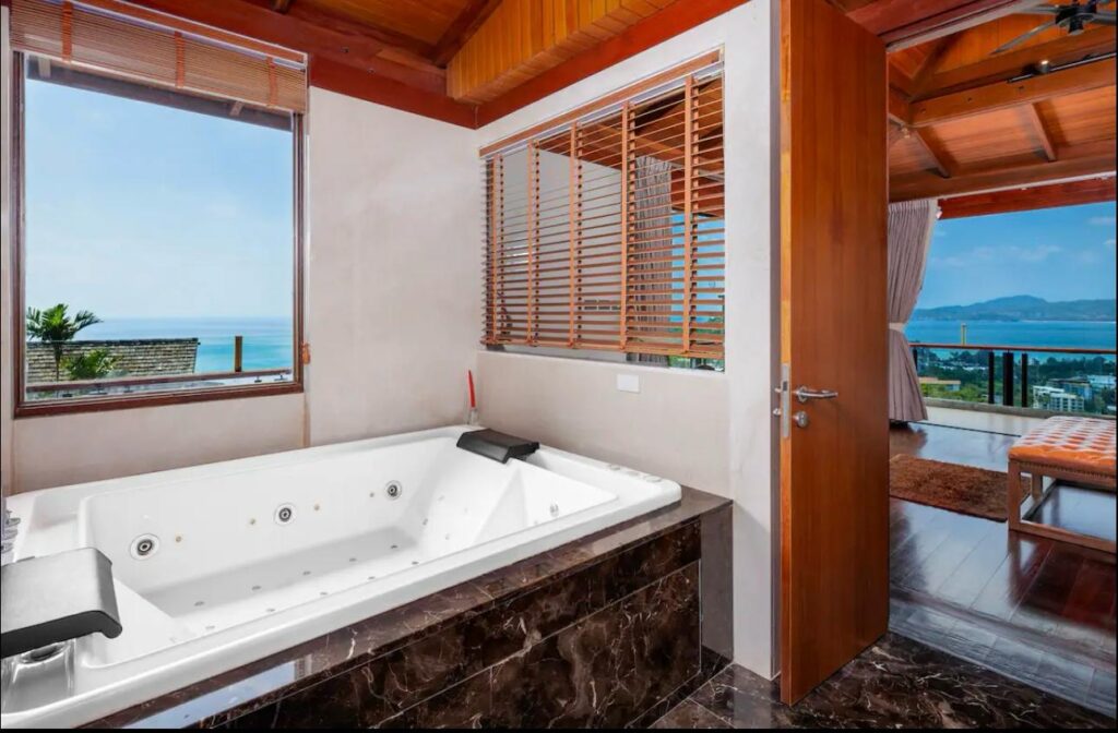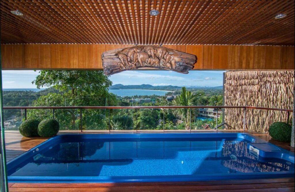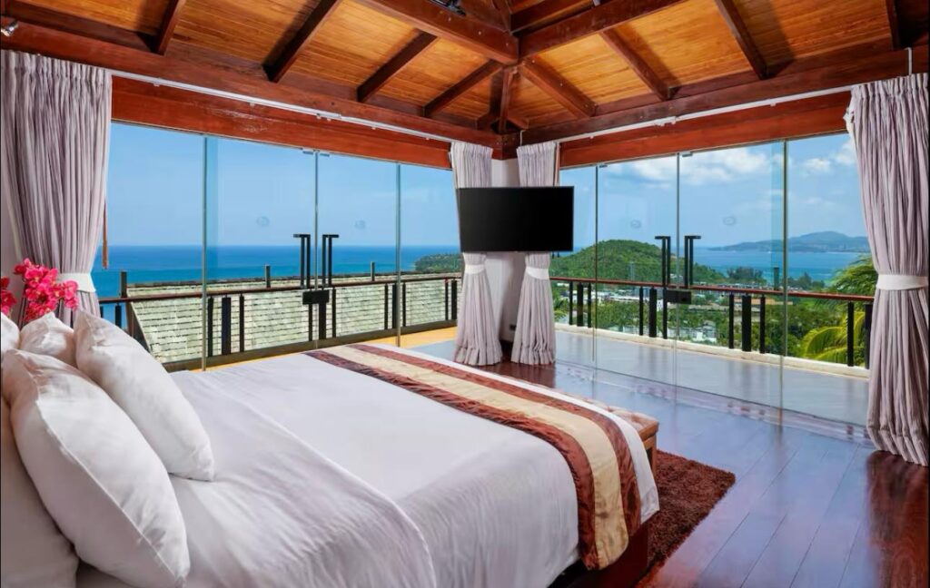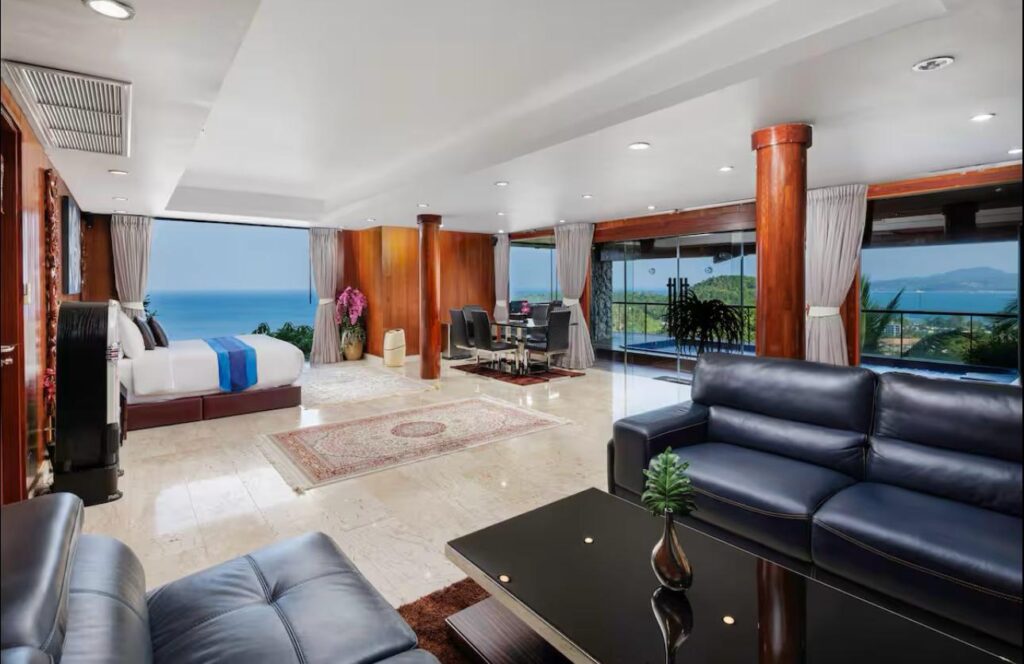 The villa includes six suite-style bedrooms with ocean views, each offering steam showers, double Jacuzzi tubs with UHD TVs, private heated pools, minibars, JBL sound systems, and more. Master Suites add 8-person Jacuzzis and private Thai gardens. All rooms feature outdoor bathtubs and panoramic views of Phuket’s three best beaches.